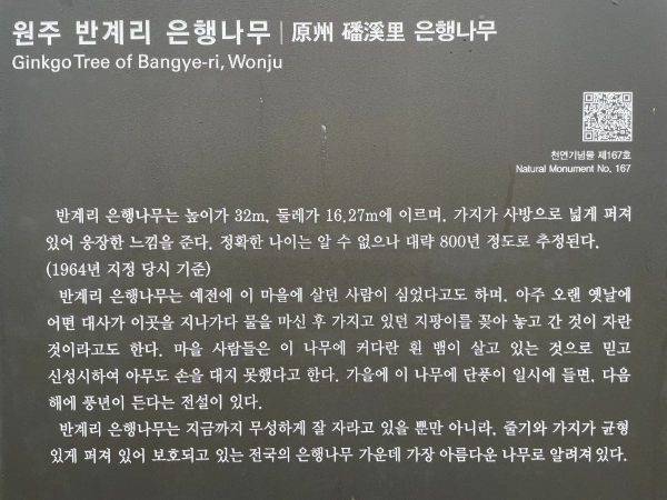 정확한 나이를 측정할 수는 없지만, 대략 800년은 넘었을 것으로 추정되며, 신성한 나무로 여겨져 지금까지 거대하게 잘 자랄 수 있었습니다. 가을이 되면 원주 반계리 은행나무는 서서히 노랗게 변하는 것이 아니라 한 번에 노랗게 옷을 갈아입는데, 이것이 차년도에 풍년이 든다는 전설이 있습니다. 또한, 이 은행나무는 천연기념물 제167호로 지정되어 있습니다.