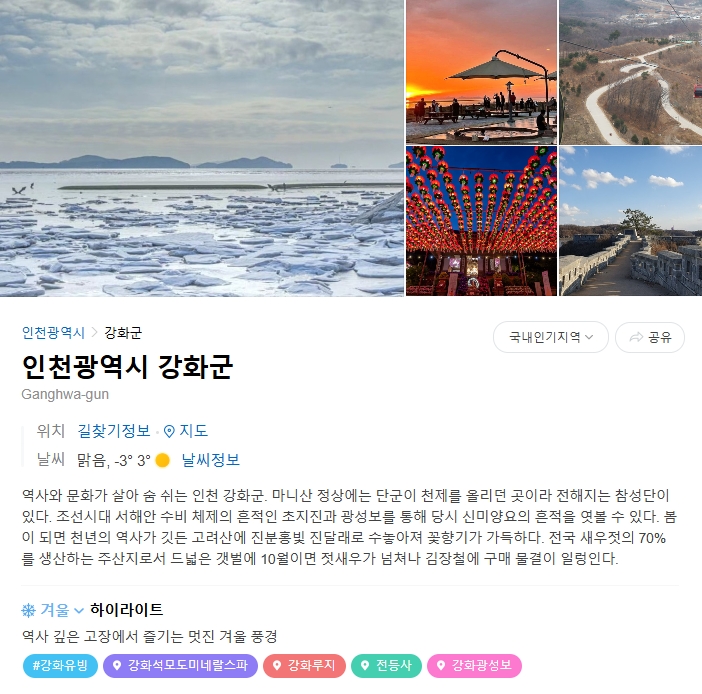 - A: 강화도 루지와 보문사가 가장 인기 있는 여행지입니다.