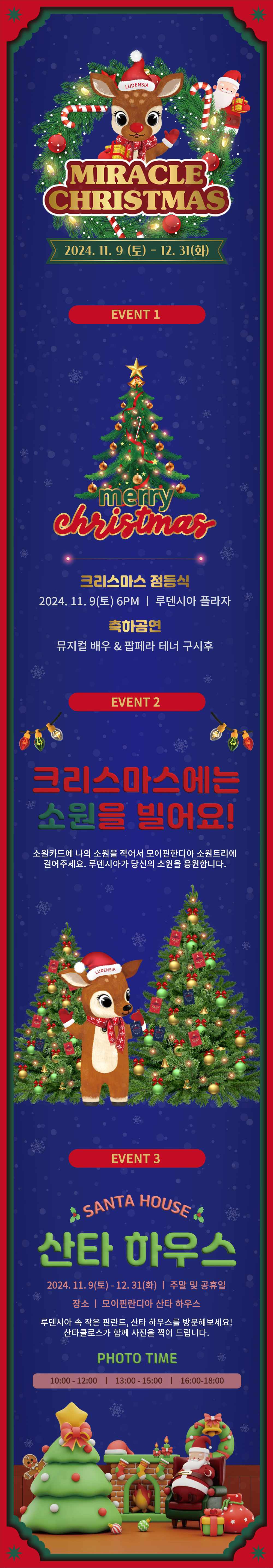 루덴시아에서는 계절마다 다양한 축제와 이벤트가 열려요. 특히 크리스마스 시즌에는 특별한 야경과 함께 다양한 프로그램이 진행되는데, 가족과 함께 따뜻한 연말을 보내기에 안성맞춤이에요.