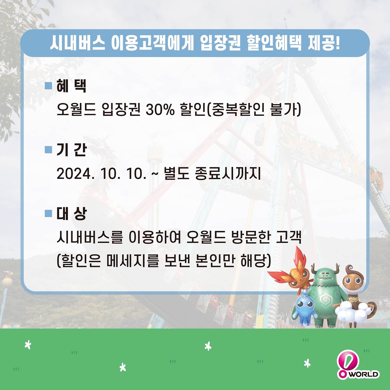 대전 오월드는 시내버스를 이용하여 방문하는 고객에게 30% 할인 혜택을 제공합니다. 이 할인은 10월 10일부터 행사 종료일까지 유효하며, 시내버스를 이용해 오월드를 방문하는 고객에게 적용됩니다.