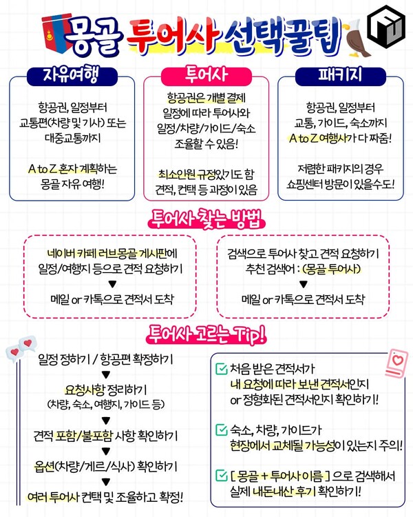 멀게만 느껴졌던 몽골 여행이 SNS를 통해 알려지며 인기 여행지로 급부상하고 있습니다. 최근에는 3박 4일, 4박 5일의 짧은 일정으로도 몽골 여행을 다녀온 후기가 알려지며 몽골 여행에 대한 수