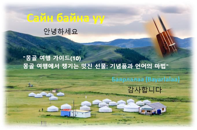 몽골 여행 가이드(10) 몽골 여행에서 챙기는 멋진 선물: 기념품과 언어의 마법. 몽골 여행의 아름다움과 문화를 담은 기념품을 탐험하고, 현지 언어로 더 친근한 경험을 즐겨보세요. 몽골어와 함