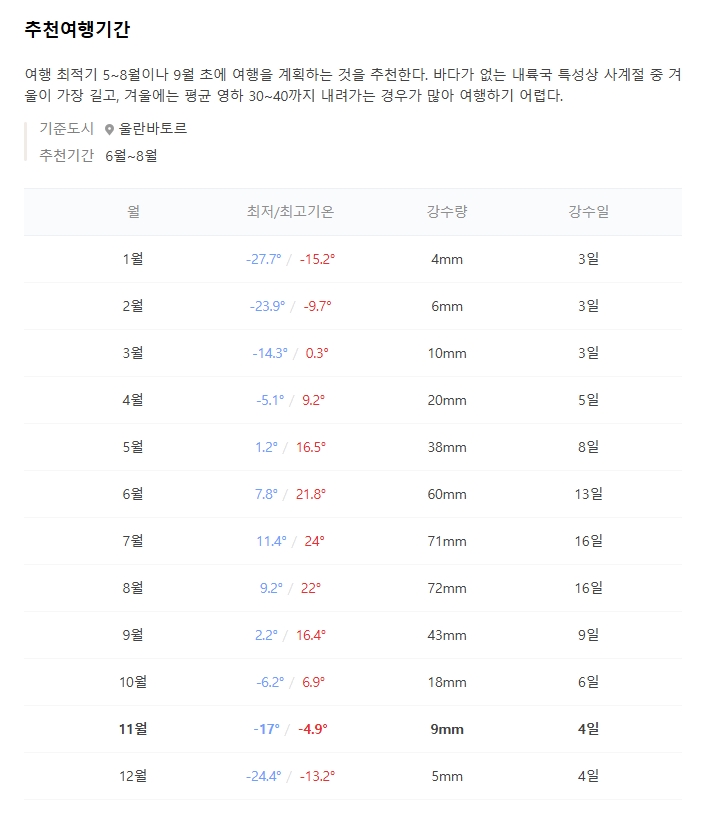 여행 시기 또한 중요합니다. 몽골은 여름철(6월~8월)이 가장 여행하기 좋은 시기로, 이 시기에 방문하면 다양한 축제와 행사도 즐길 수 있습니다. 하지만 겨울철(12월~2월)은 매우 추운 날씨가 지속되므로, 이 시기를 피하는 것이 좋습니다.