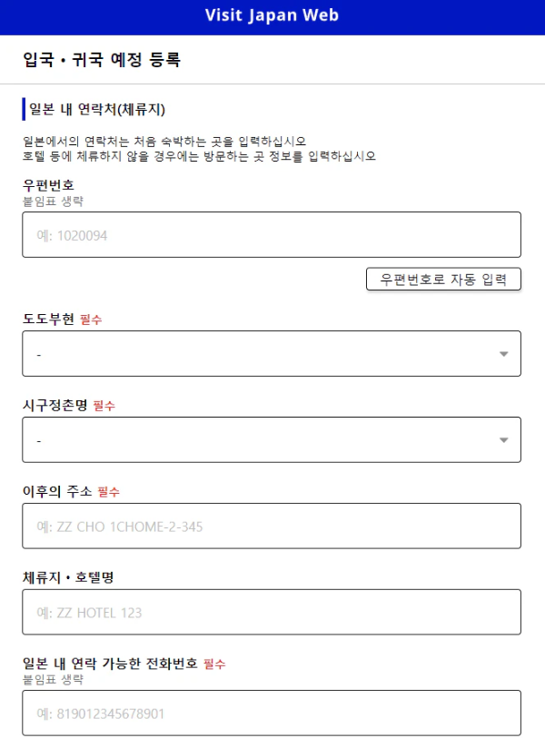 - "일본 내 연락처" 항목에서 "우편번호"를 입력하면 자동으로 주소가 입력됩니다.