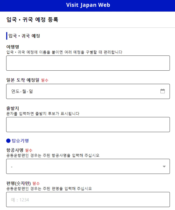 - "입국일자", "탑승기 편명", "출발지"는 이미 등록되어 있으므로 입력하지 않아도 됩니다.