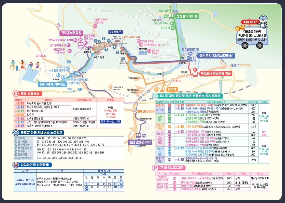 축제 기간 동안 서울, 부산 등 주요 도시에서 진주까지 연결되는 셔틀버스가 운영됩니다. 미리 예매를 통해 편리하게 이동할 수 있습니다.