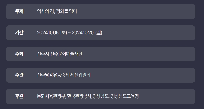 [3] 진주문화관광재단 - 2024 진주남강유등축제 외 불꽃놀이 개최 (https://jjct.or.kr/sub1_4_10)