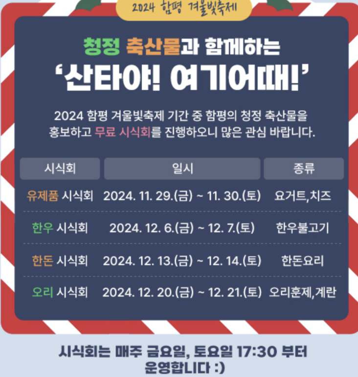 축제 기간 동안 다양한 공연과 체험 부스가 운영됩니다. 특히, 11월 29일부터 12월 21일까지는 무료 시식 이벤트가 열리며, 한우, 전통 한식, 요거트 및 치즈 시식 등이 준비되어 있습니다. 자세한 내용은 아래 그림 참고해주세요!