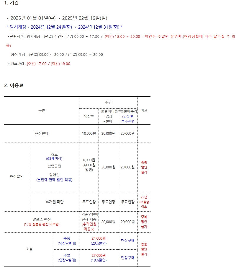 주중/주말, 구매방법(현장/소셜) 등에 따라 이용요금이 다르므로 반드시 사전에 확인 후, 방문하시기 바랍니다.