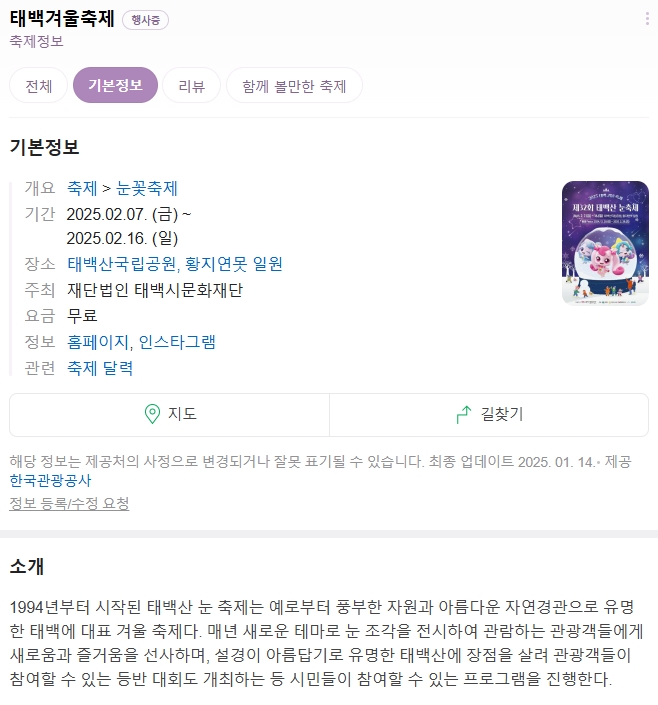 [1] NAVER - 2025 태백산 눈꽃축제 기본정보 가수 라인업 티니핑 태백 눈축제 (https://in.naver.com/houself/contents/internal/787074997355296)